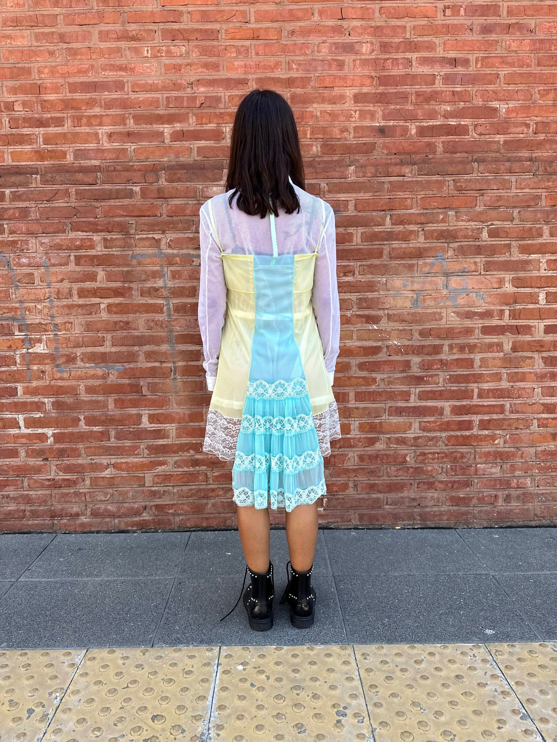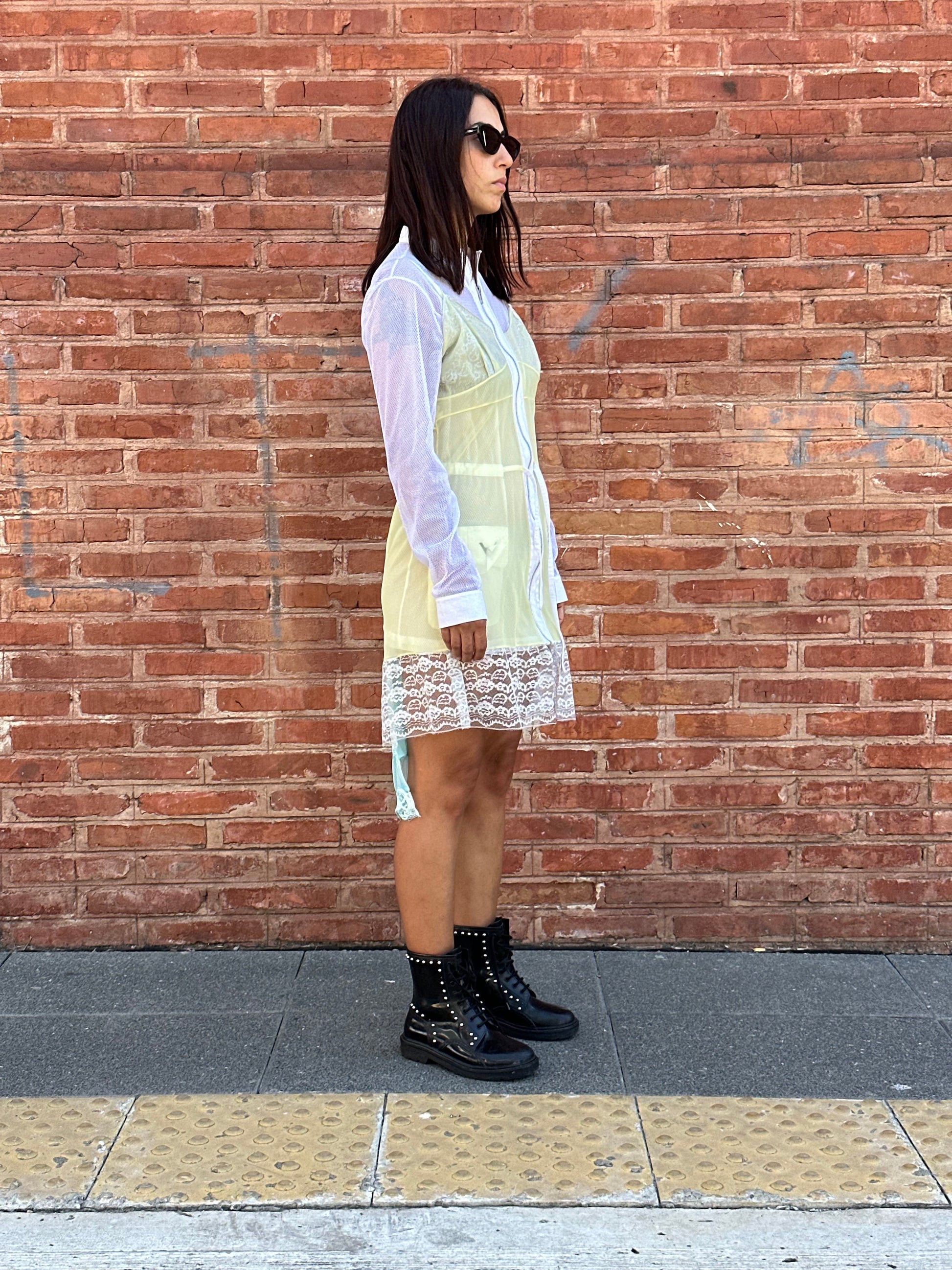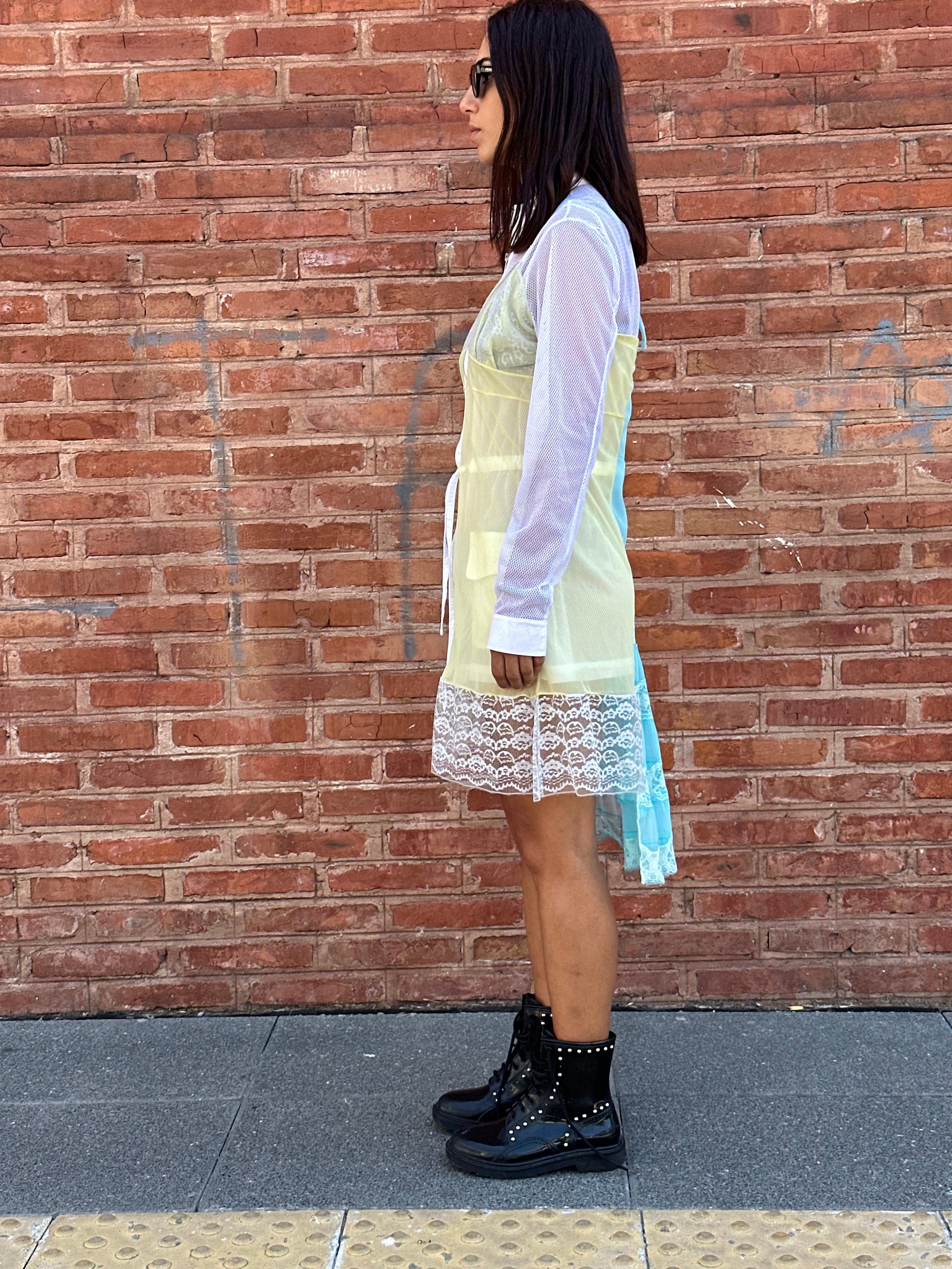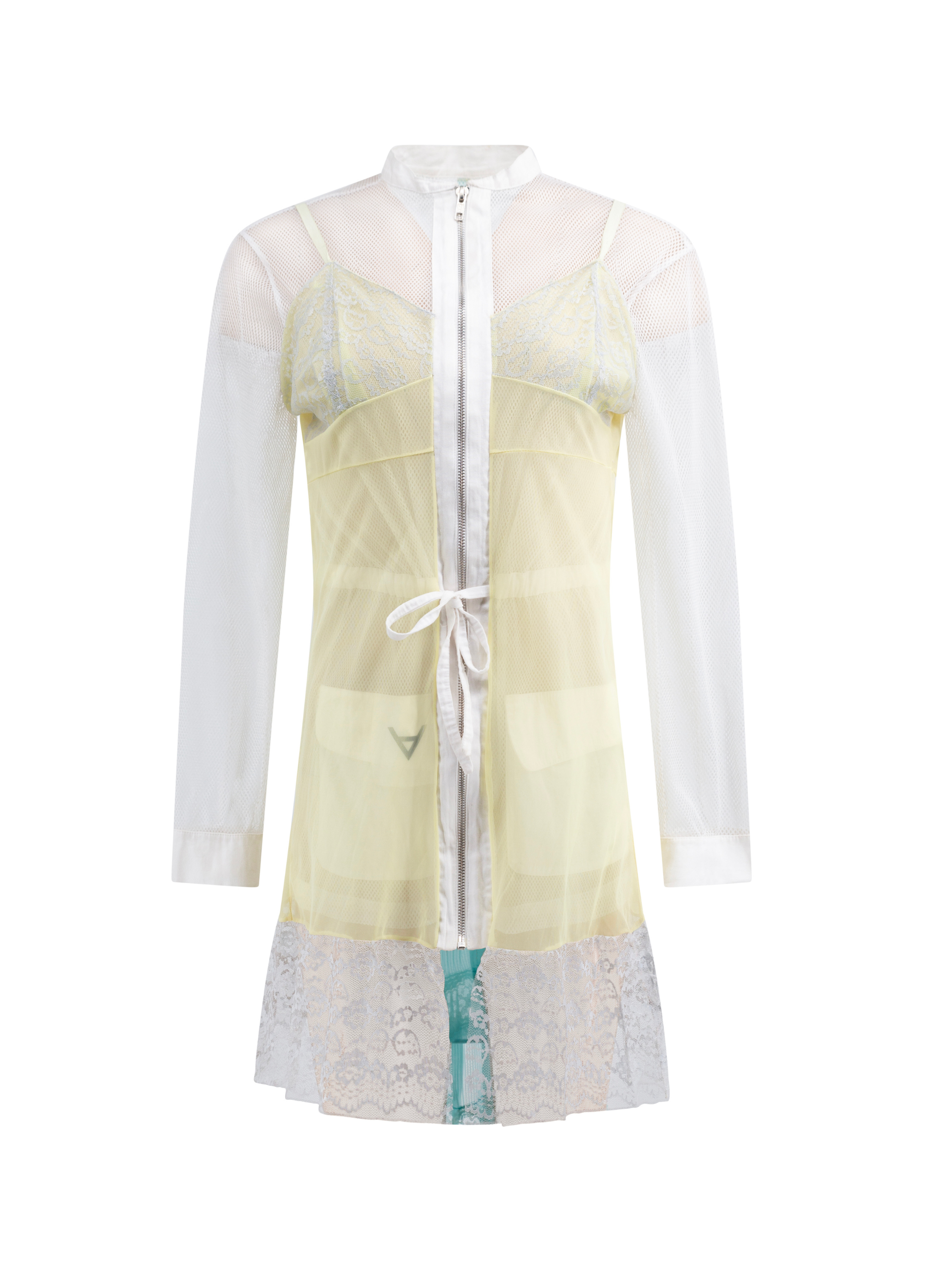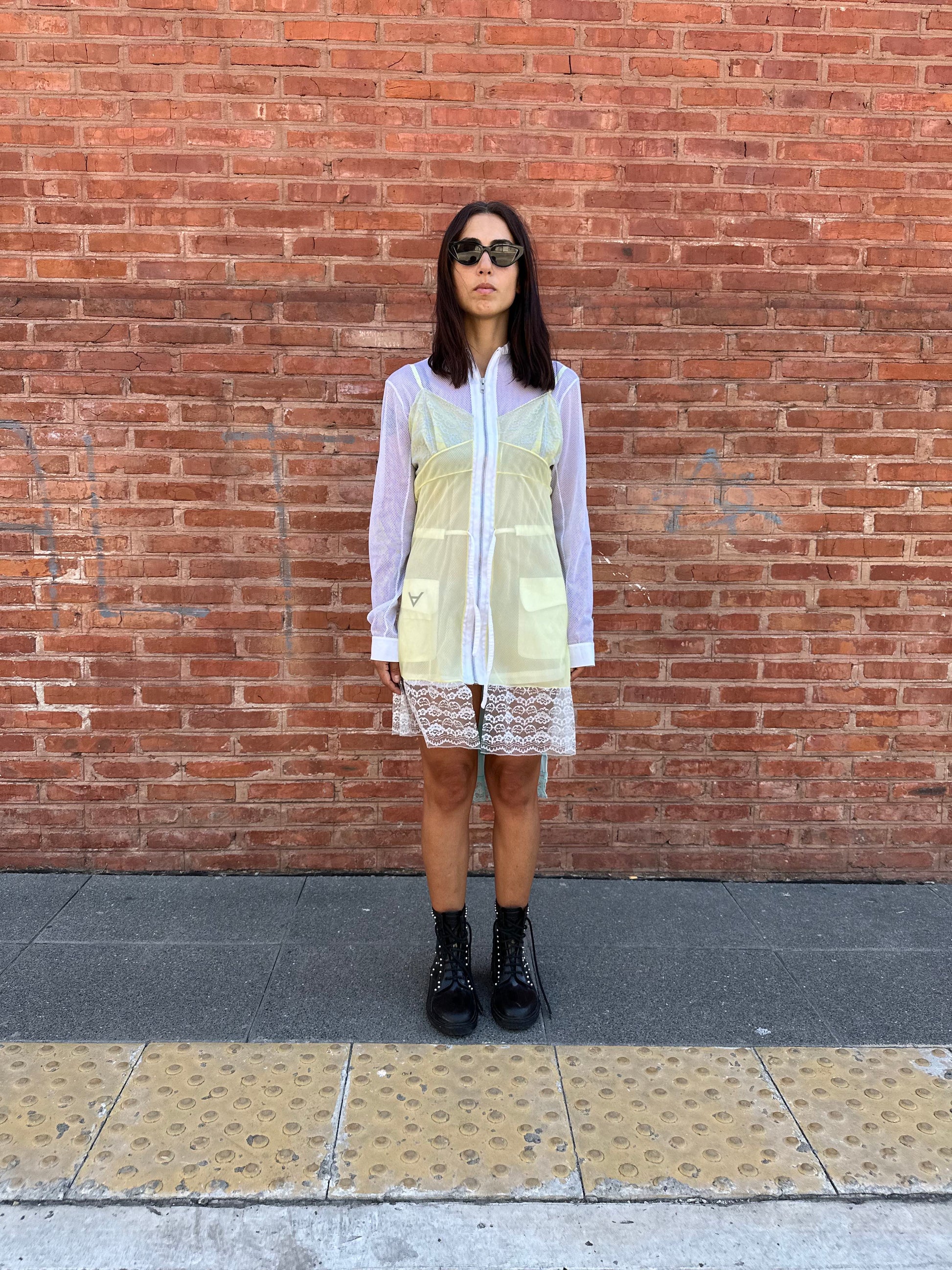 This unique one-of-a-kind piece is made from upcycled vintage goods, ensuring sustainability and reducing waste. The front of the garment features a stylish zipper and you can see logo and a mesh textile, adding a trendy touch to the design. You'll love the unique look and feel of this garment, knowing that it was made with sustainability in mind. Don't miss out on the chance to add this eco-friendly piece to your wardrobe.