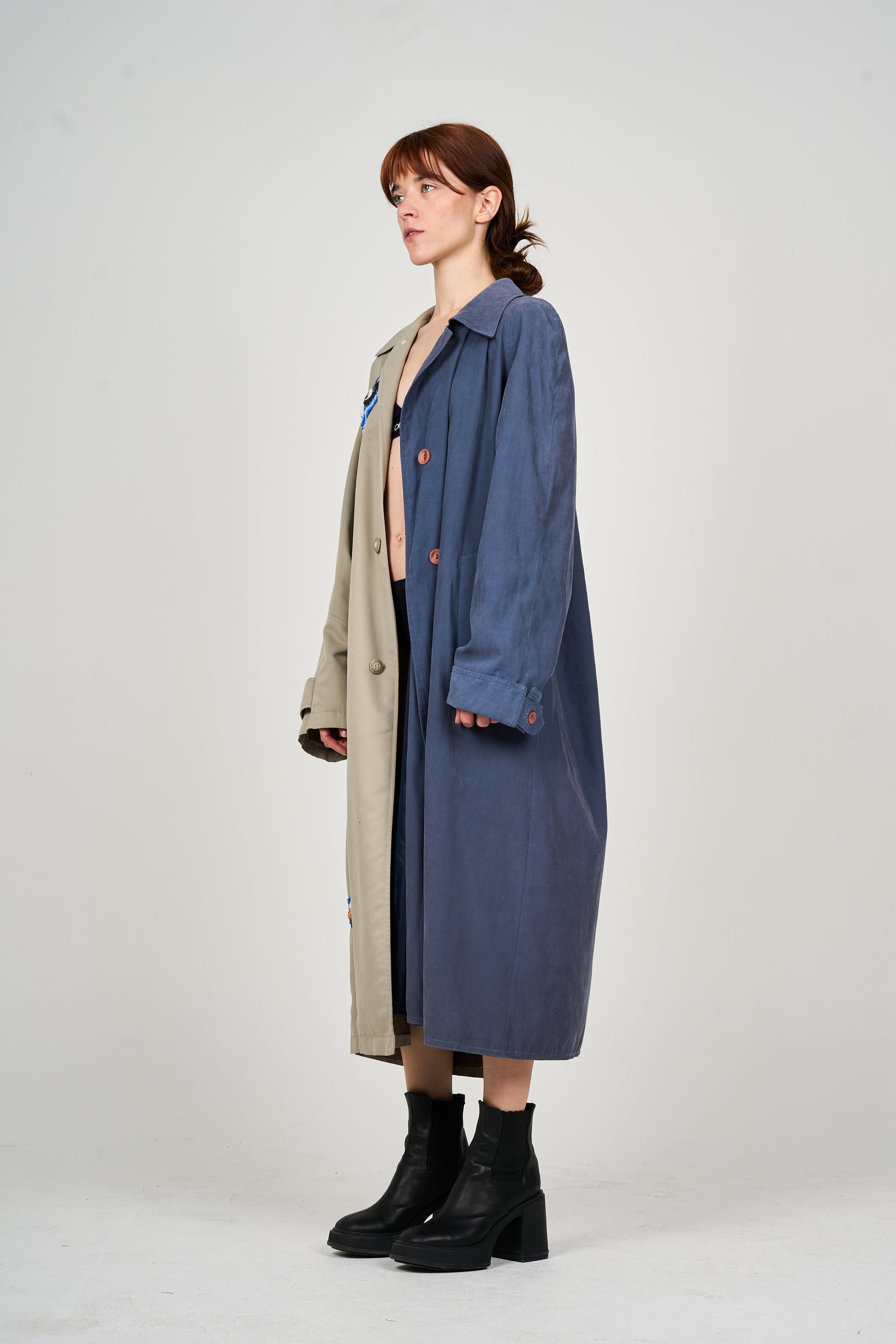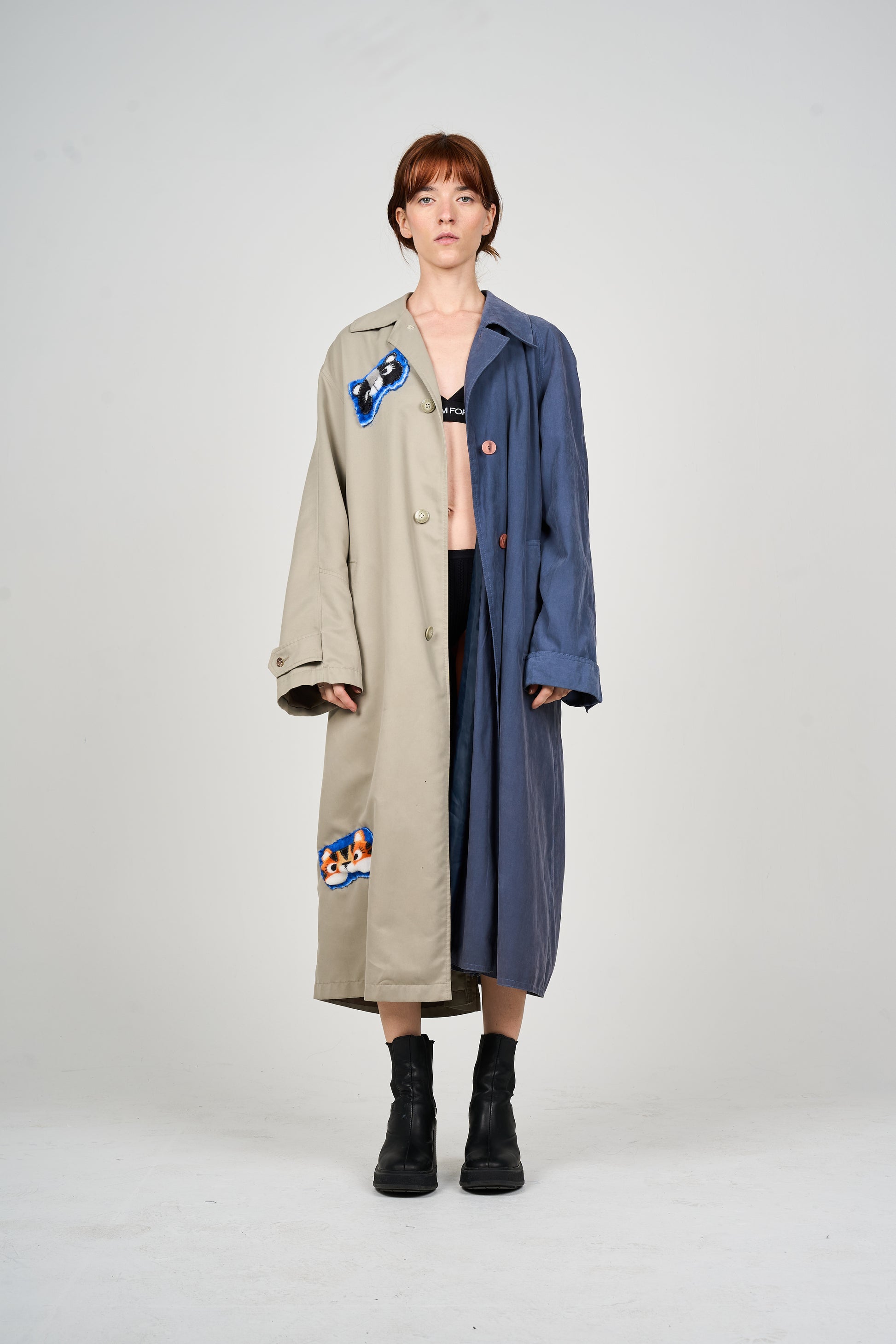 Introducing the Alenkie Upcycled Trench, a one-of-a-kind and sustainable piece of wearable art that's handmade in Argentina. It's crafted using a mixture of repurposed materials, combining a Burberry coat with another fabric, with patches to create a unique, super cool design.