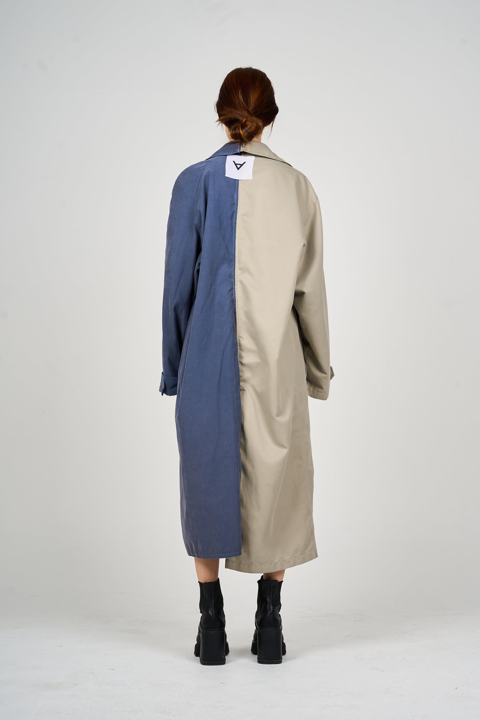 This trench coat is individually designed and carefully made by hand to ensure its high quality, durability, and timeless appeal. The upcycling process encourages sustainable fashion choices, reducing waste and promoting more environmentally friendly clothing.