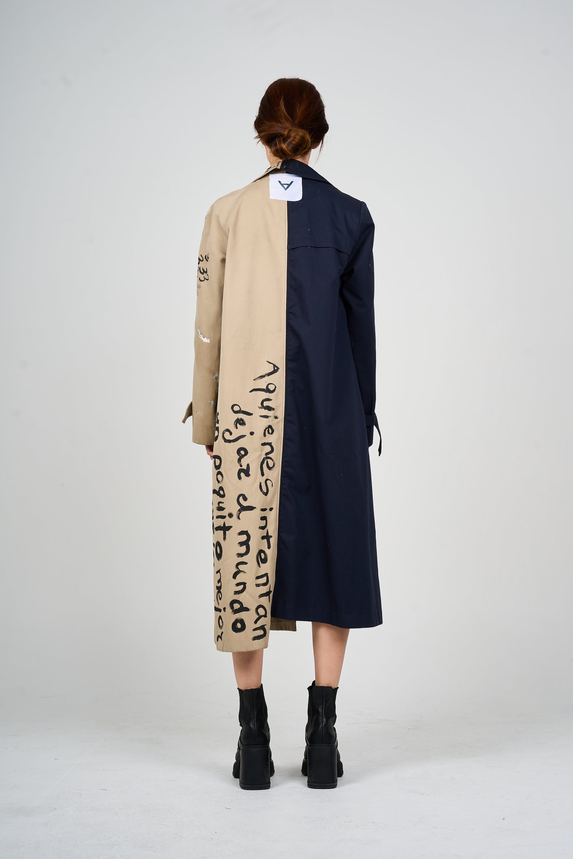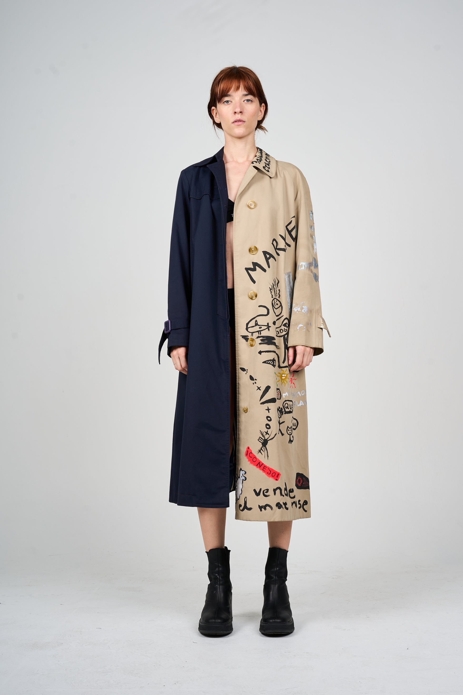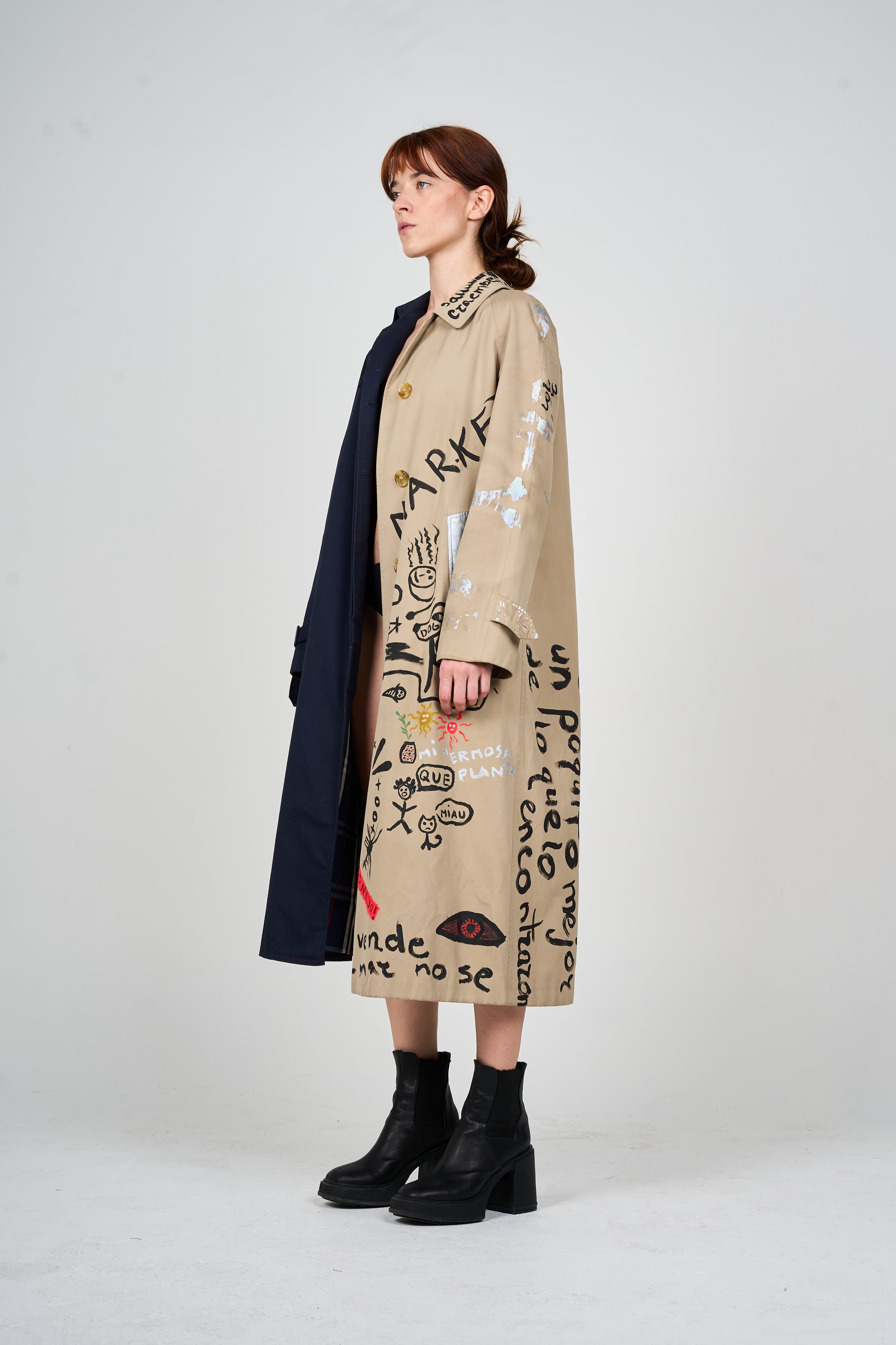 Introducing the Alenkie Upcycled Trench! This unique and sustainable trench coat is handmade in Argentina, using a mix of repurposed materials, combining a Burberry coat with another fabric to create a distinctive and chic design. The trench coat is further adorned with hand-drawn designs and paintings, making it a true piece of wearable art.