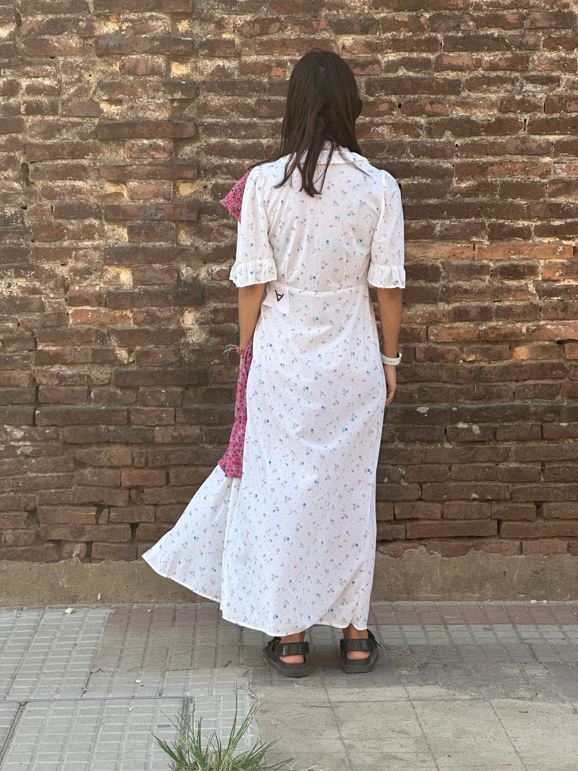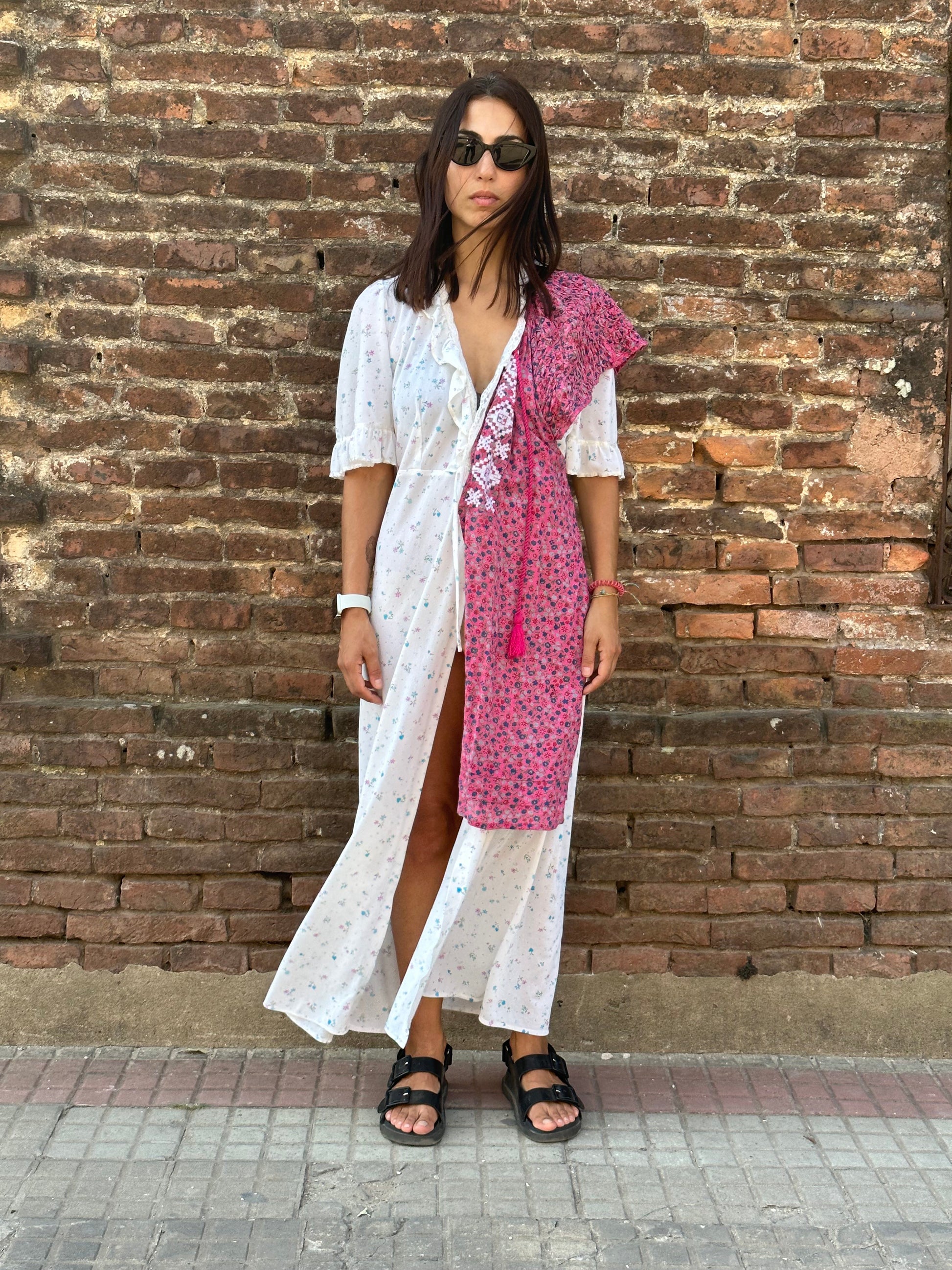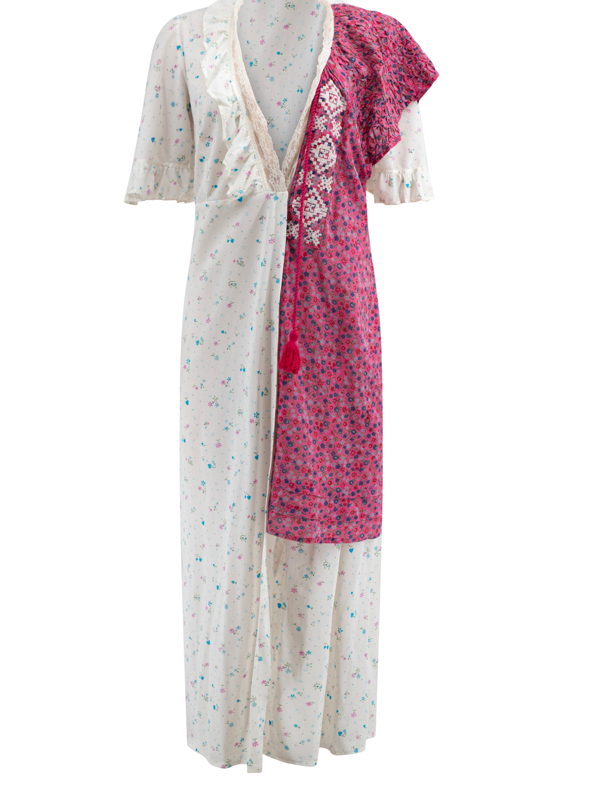 floral prints. Sustainable upcycled dress that has been carefully handcrafted using vintage luxury goods and features traditional Ukrainian embroidery. The addition of flower prints and traditional embroidery on the front detail adds a touch of elegance and cultural significance to the dress. It's essential to embrace eco-friendly options in all aspects of our lives, and this dress is a beautiful way to start.