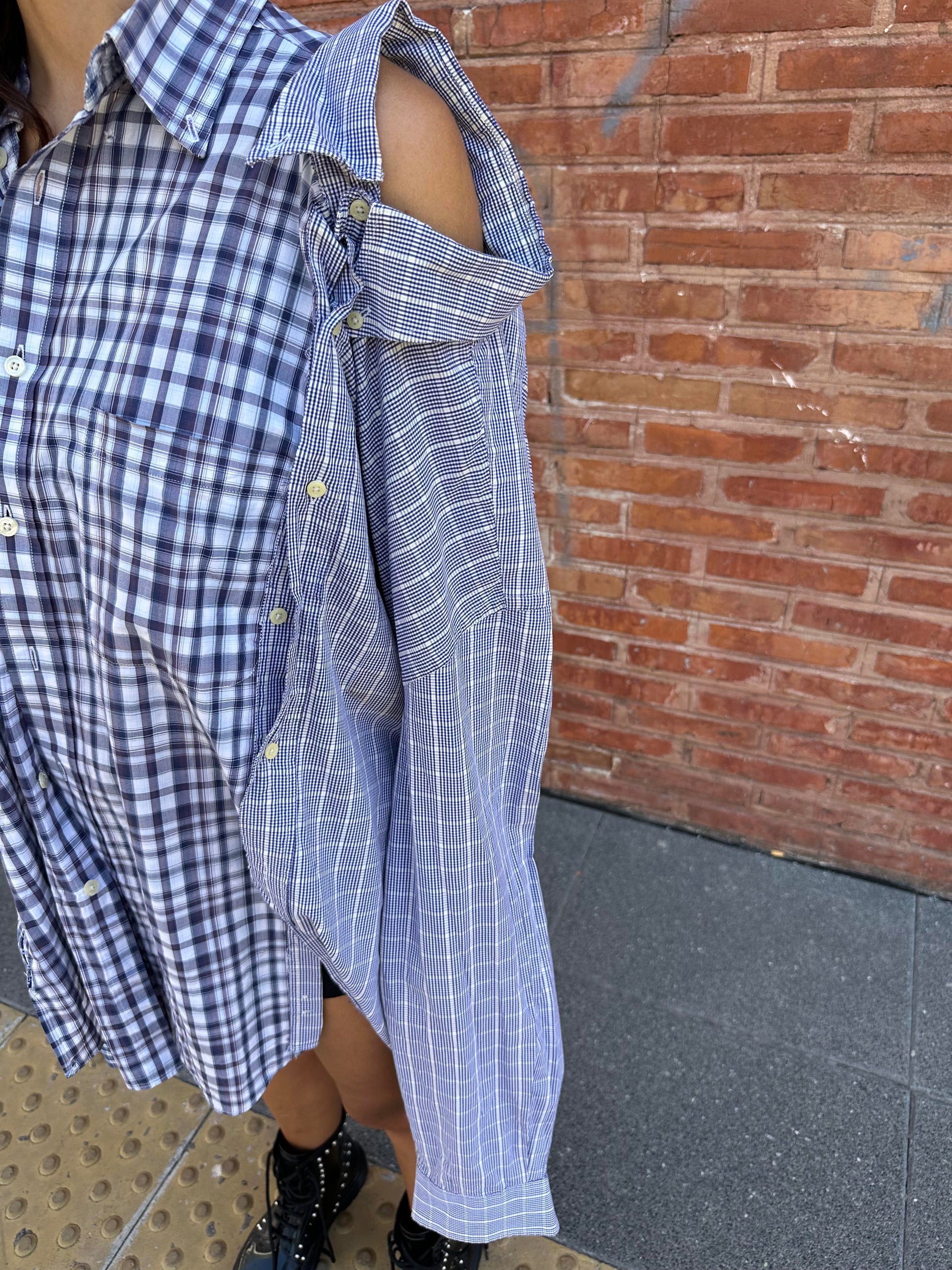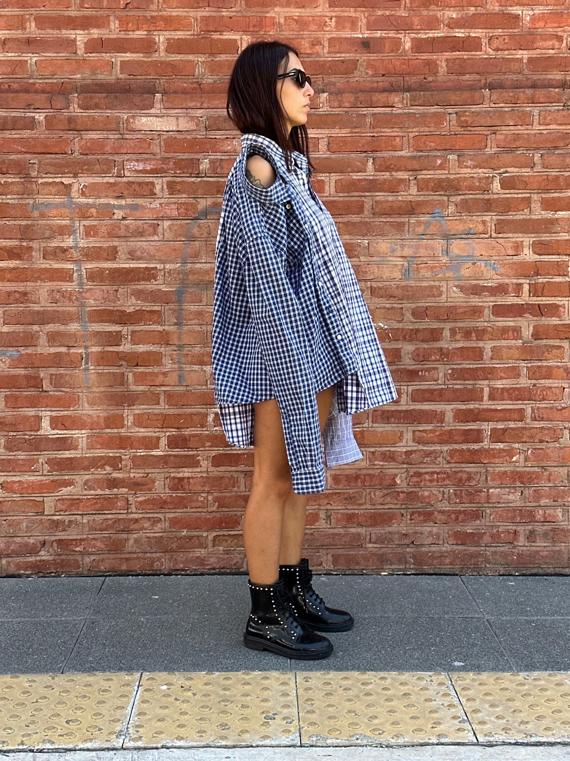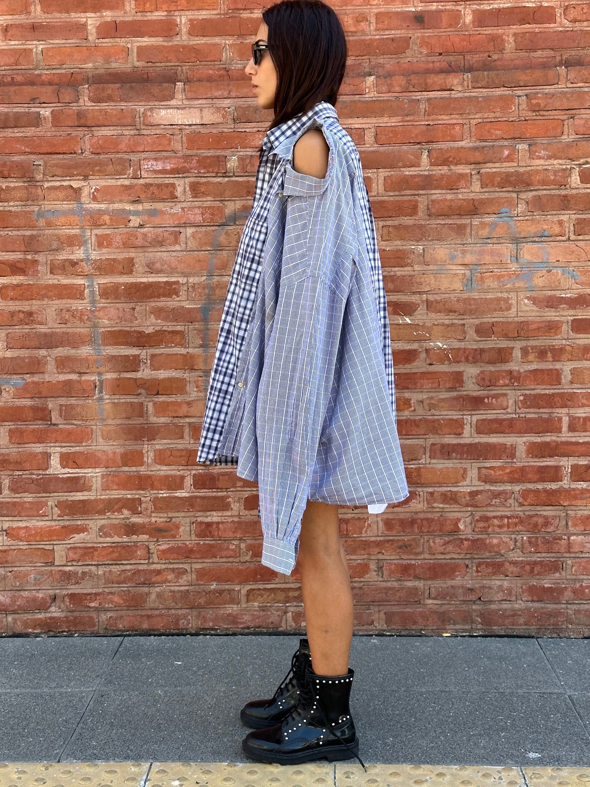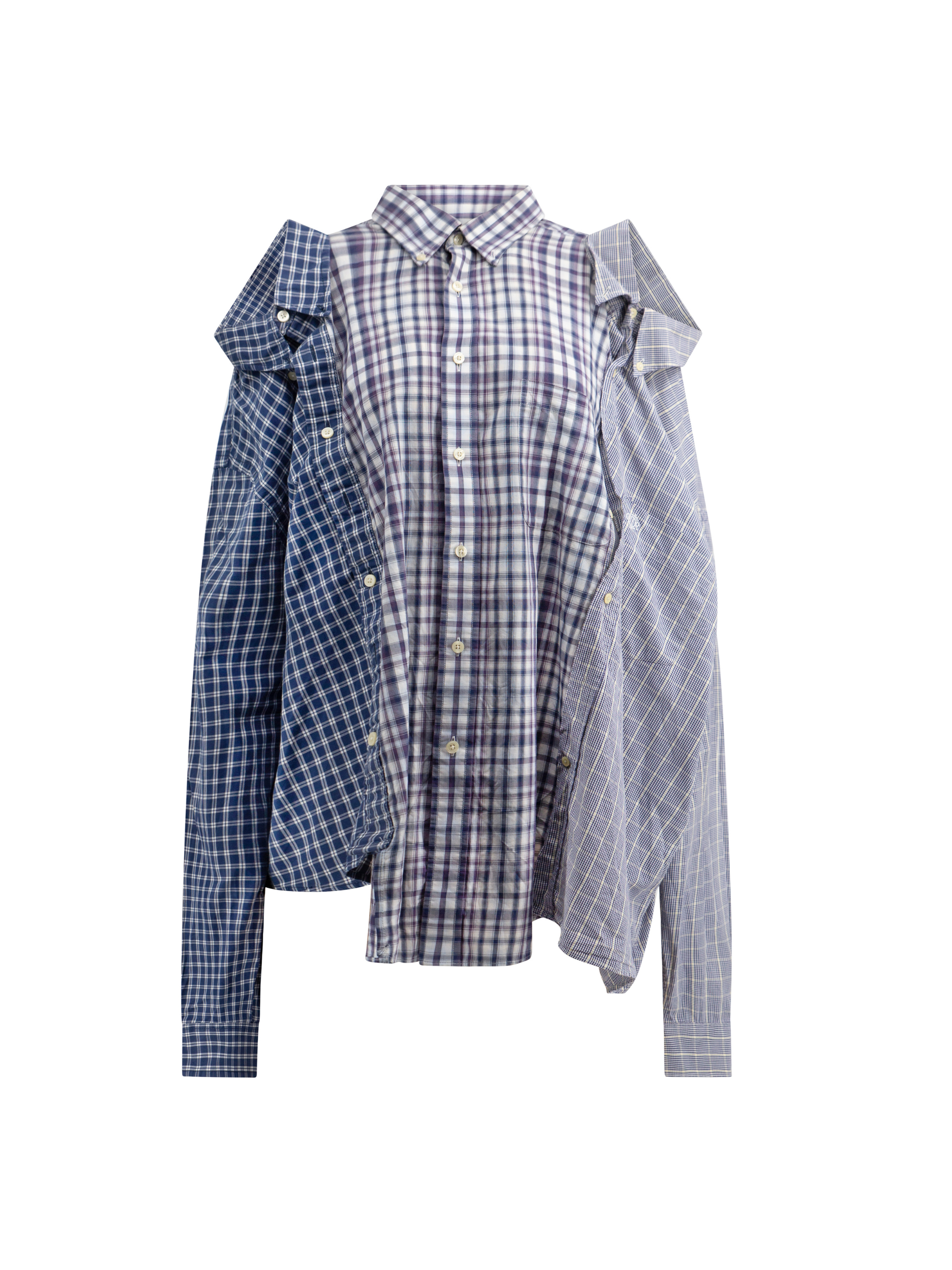 Alenkie's piece combines the base of one basic essential shirt with two others on either side. Each piece in this collection is carefully crafted using high-quality materials sourced from pre-loved shirts, reducing textile waste and giving a new life to beautiful fabrics. This one-of-a-kind garment have a many details like very long sleeves, many bottoms and you can choose which side of shirt to wear. Of course, it wouldn’t be Alenkie without a twist or two, with this piece’s of four distinctive check patterns, each one upcycled from a vintage shirt for maximum sustainability points. This piece showing of both masculine and feminine, casual and aesthetic.