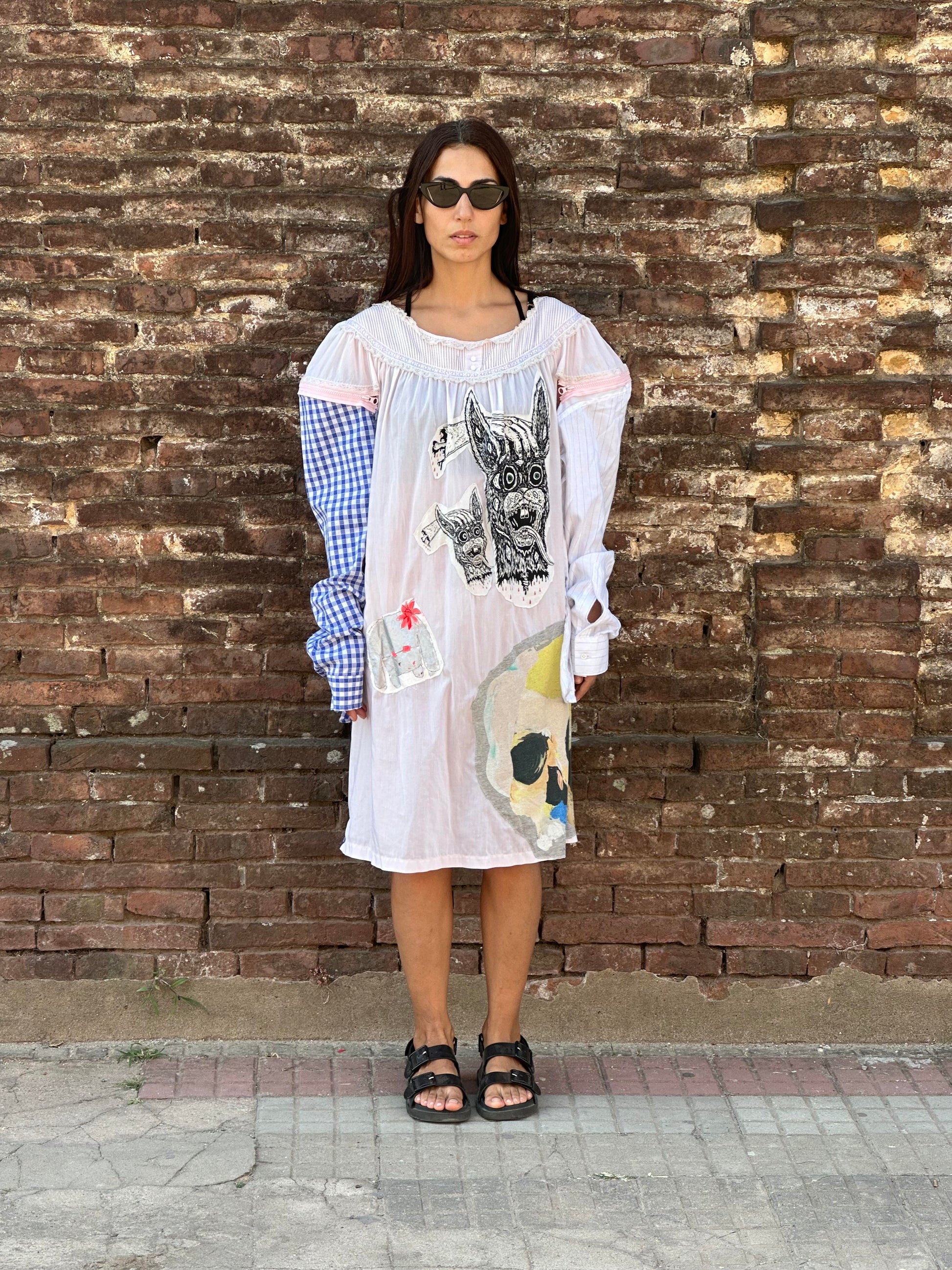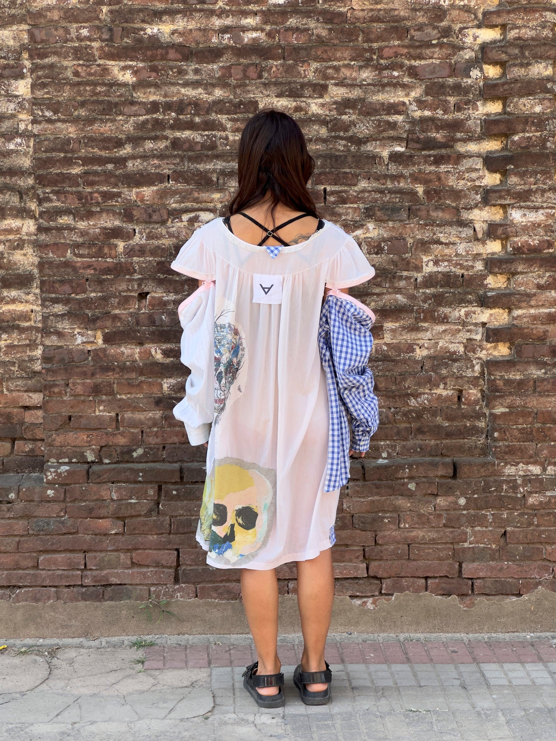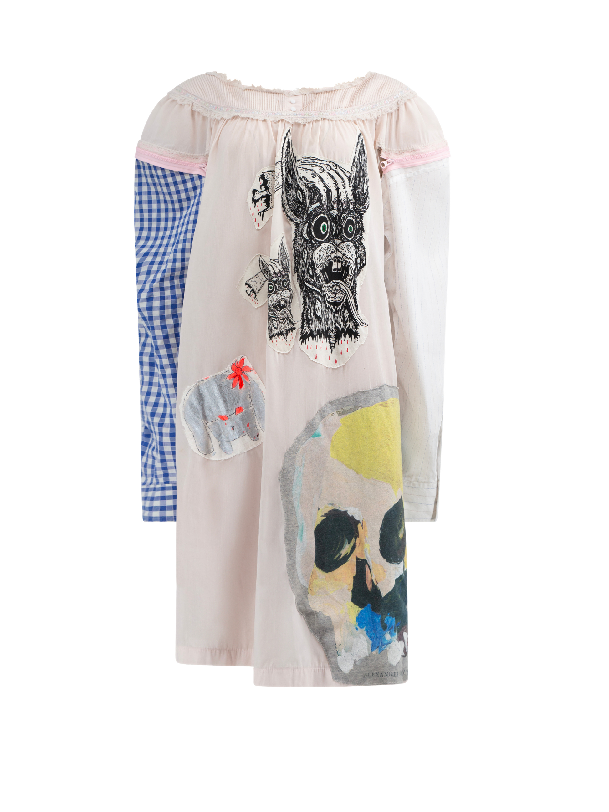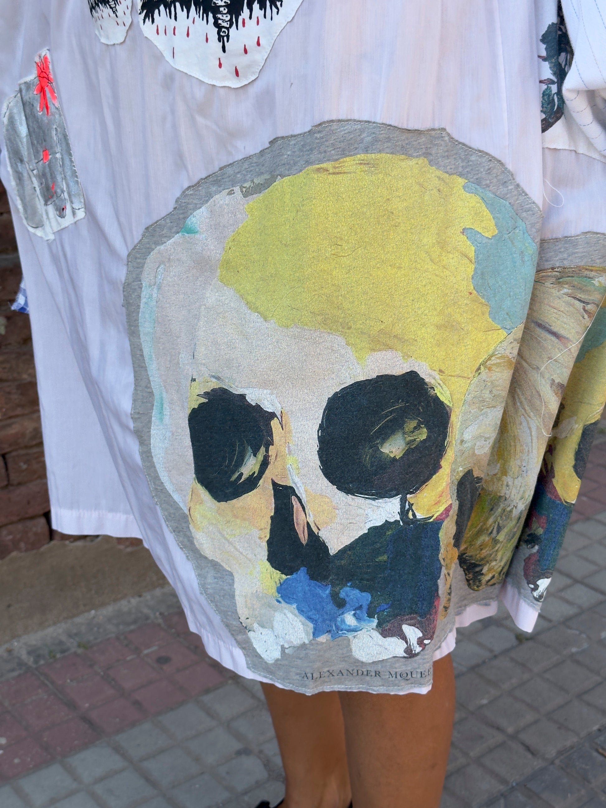Upcycled Shirt-Dress With Alexander Mcqueen Prints in White/Cream