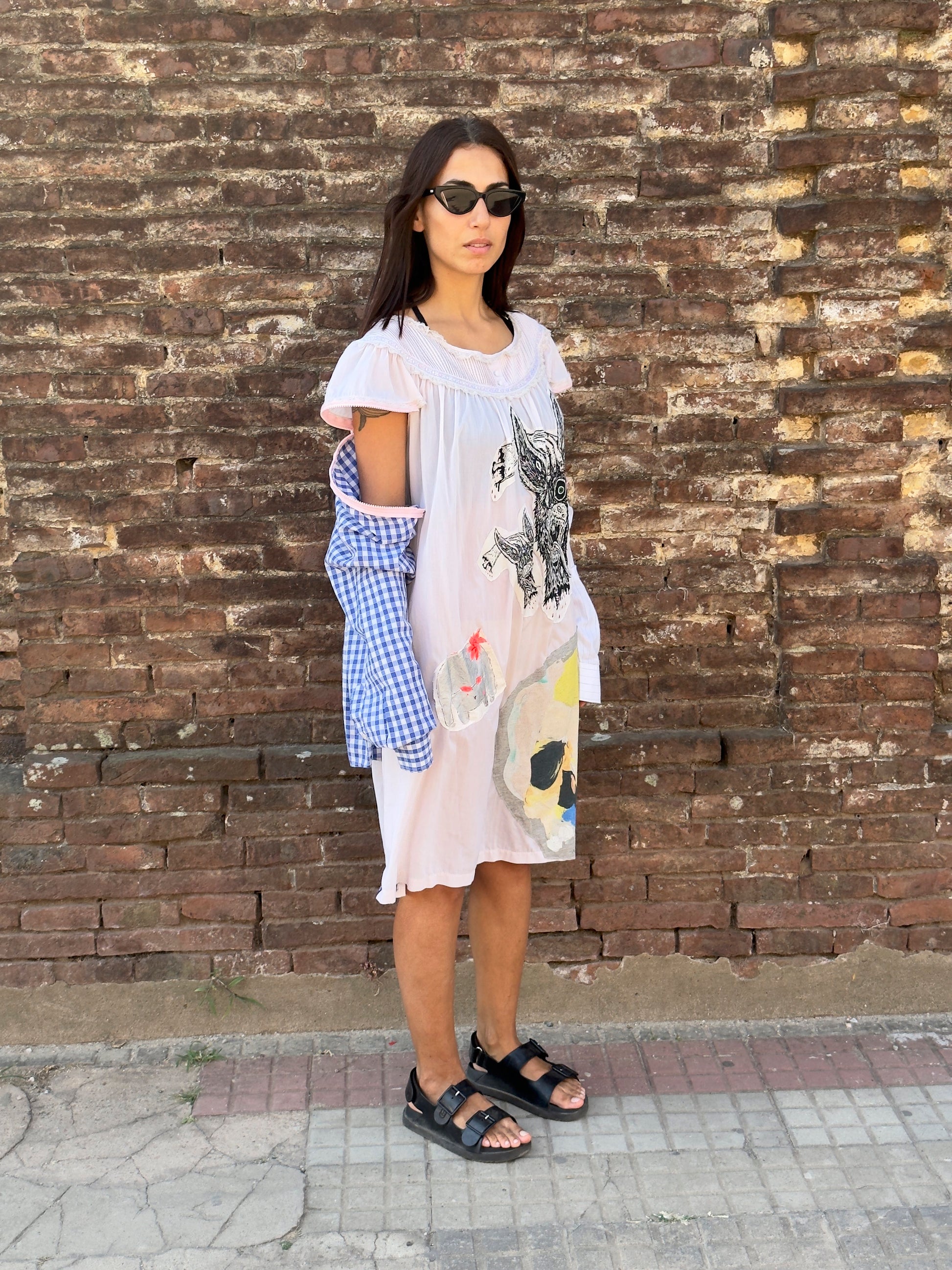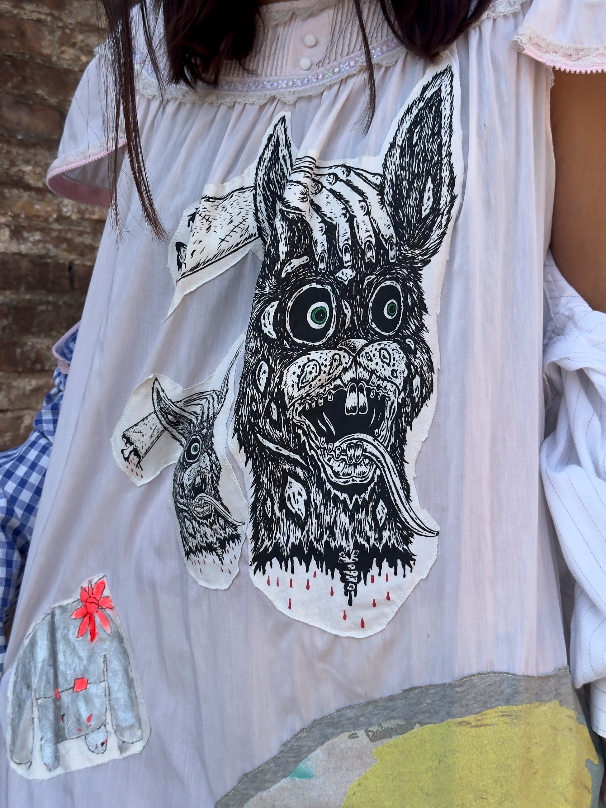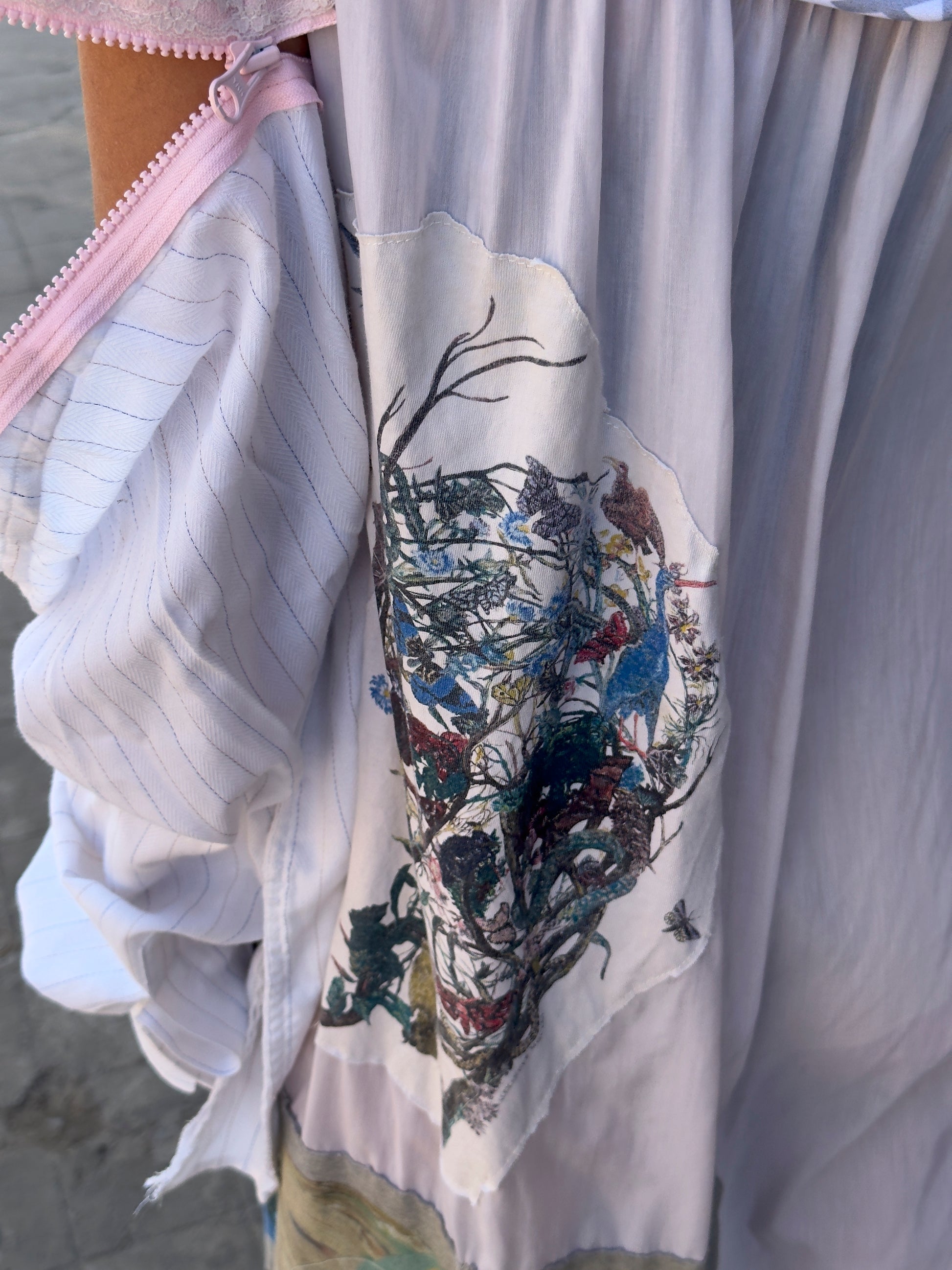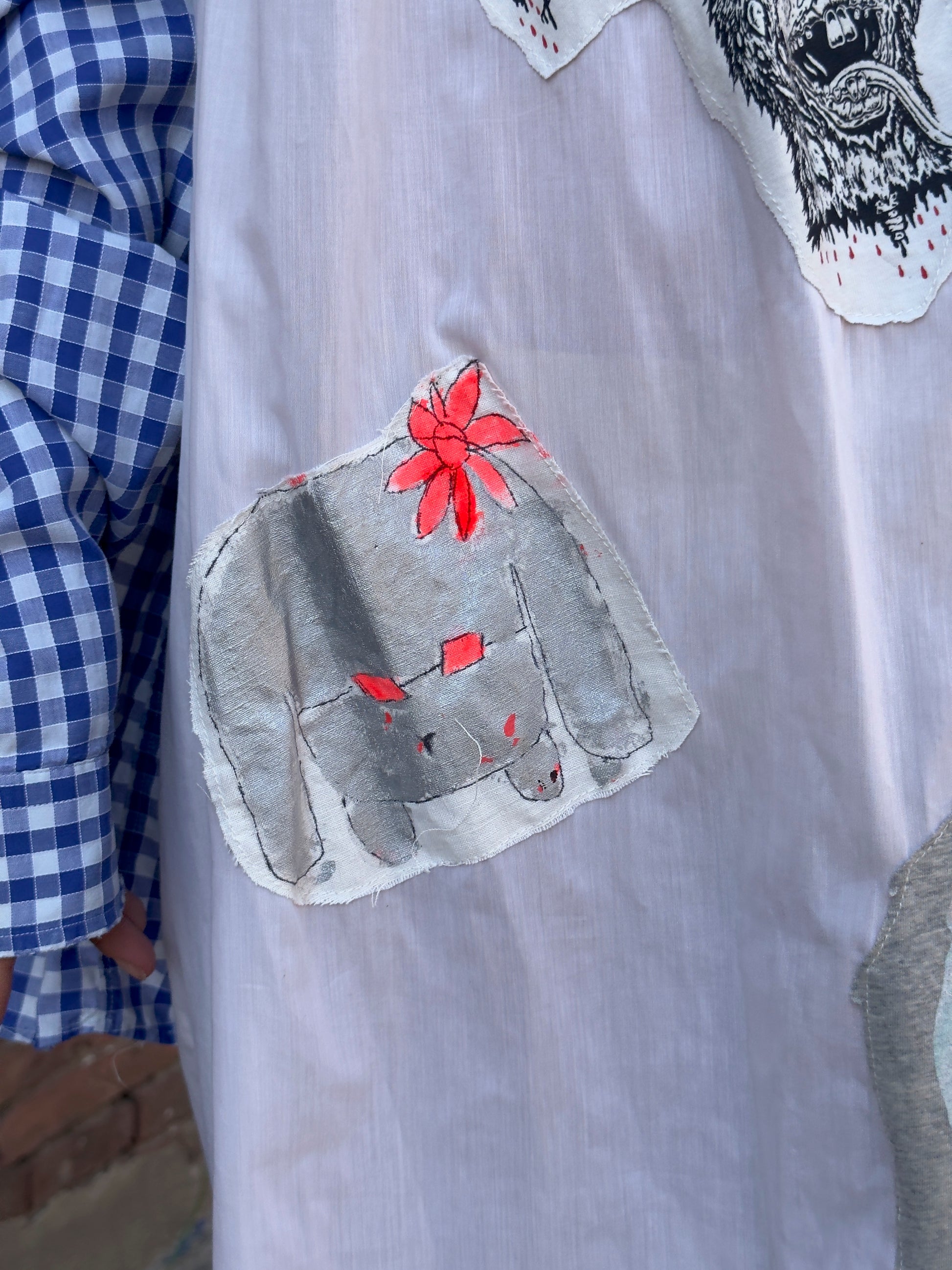 Alenkie’s sustainable dress, the perfect addition to any creative wardrobe! This dress is one-of-a-kind, made from upcycled materials sourced from Alexander McQueen. The front side of the dress features hand-painted silver Bunny, making it a true work of art. The dress also features Dior shirt sleeves that can be opened with a baby pink zipper, adding versatility to the design. Not only will you look great in this dress, but you can feel good knowing that it was made sustainably, reducing waste and environmental impact.